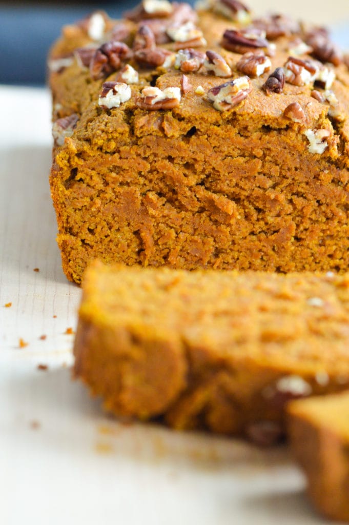 The base of this pumpkin bread is whole wheat flour, which has more protein and fiber than traditional white flours. That means the bread is dense and packed with nutrition.
