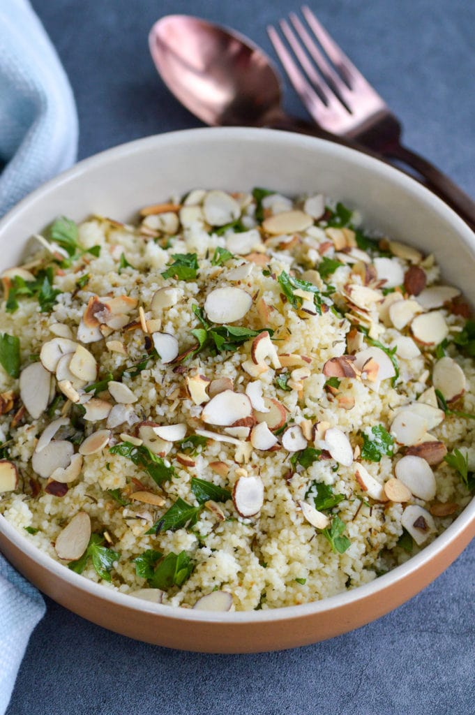 This vegan couscous recipe is a simple side dish ready in 10 minutes. With a unique za’atar vinaigrette, parsley & sliced almonds!