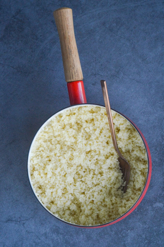 To make the couscous bring water to a bowl in the pot, then add the couscous. Remove it from the heat and fluff with a fork.