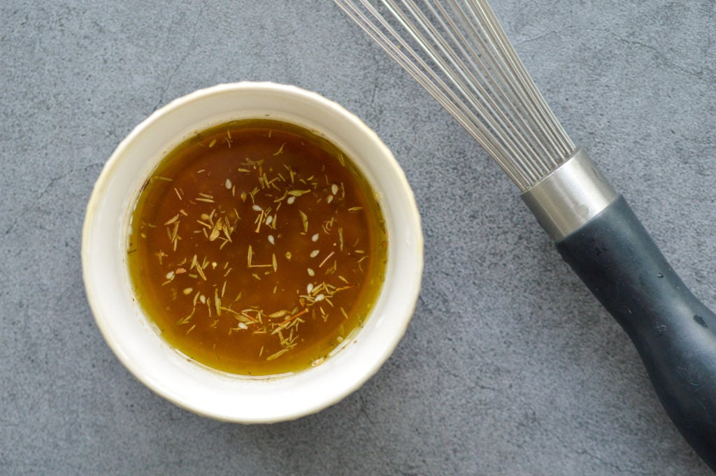 Next, make the dressing. Whisk together the lemon juice, olive oil, za’atar seasoning in a small bowl.