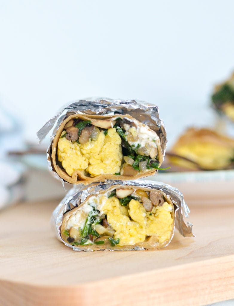 To avoid the latter situation, I’ve put systems in place to take some time for relaxation and fueling in the morning. For example, I’ve implemented a hard “no computer before 9 am” rule, and I make a healthy breakfast ahead of time. That may sound like a lot of work, but I promise you it’s easy with these make-ahead Mushroom Freezer Breakfast Burritos. I prepare a big batch at the beginning of the week, freeze them and microwave in the morning for a hearty breakfast that is jam packed with nutrients.