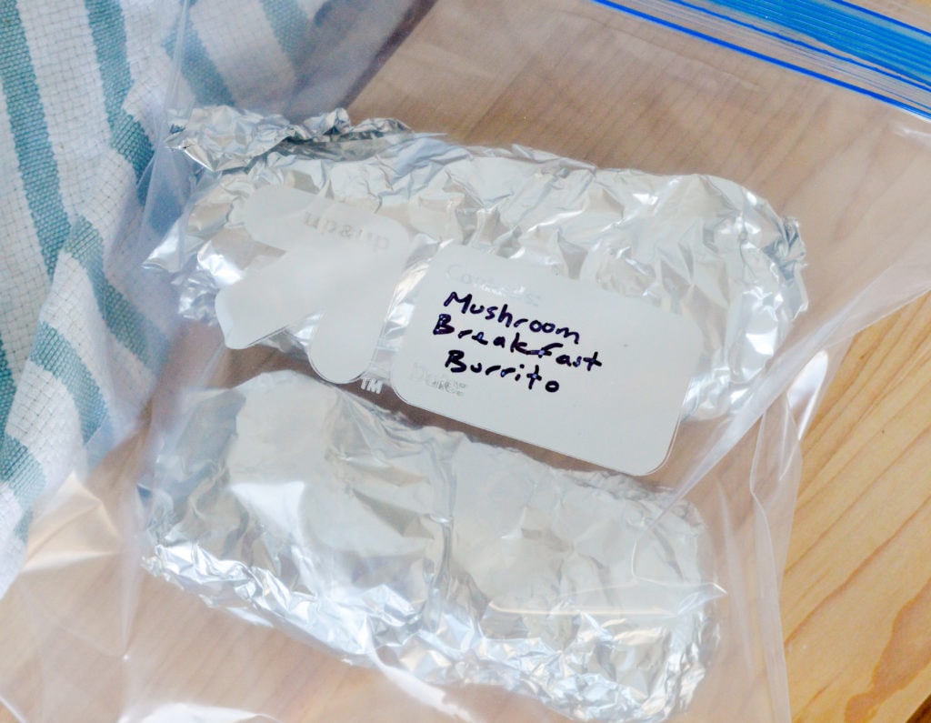 - Heat tortillas in the microwave and lay them out on four separate pieces of aluminum foil. Spread goat cheese on each tortilla and add roasted vegetables and scrambled eggs. Roll up in the foil and place in a freezer bag. Freeze.