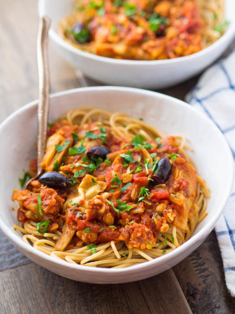 4. Spaghetti with Tempeh Sausage Marinara and Artichokes by Rachael Hartley Nutrition