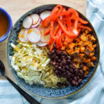 This Southwestern Quinoa Power Bowl has a little bit of everything– sweet potatoes, black beans, crunchy veggies, hearty protein and a tangy dressing.  It’s perfect for vegan meal prepping!