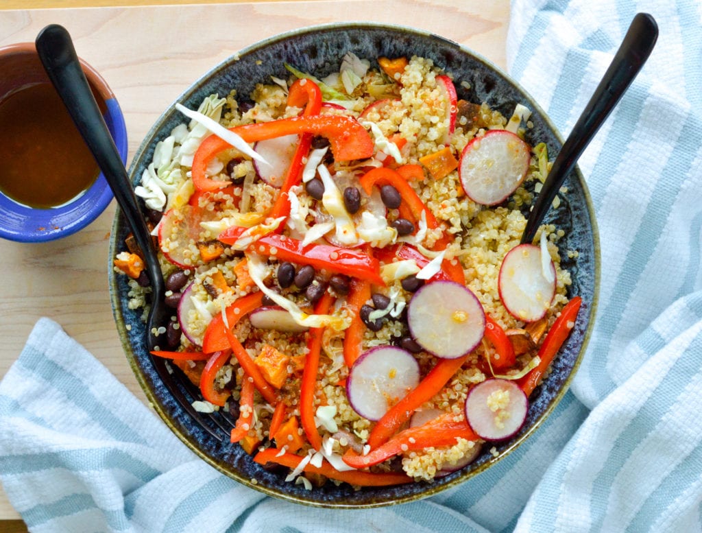 Pepper, radishes and cabbage stay crunchy for a long period of time. And roasted sweet potatoes, black beans and quinoa taste good hot or cold. Just make sure you eat the entire mixture within 5 days.